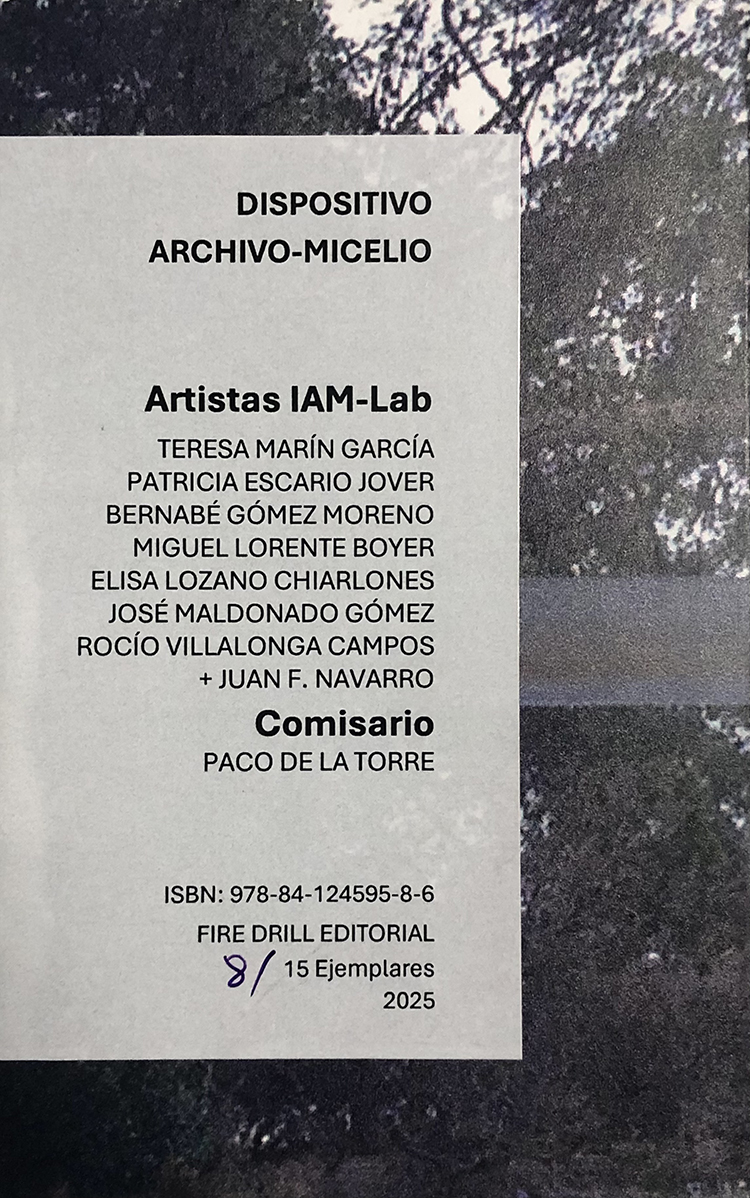 IAM-Lab [Patricia Escario Jover, Miguel Lorente Boyer (coord.), Teresa Marín García, Bernabé Gómez Moreno, José Maldonado Gómez, Elisa Lozano Chiarlones, Rocío Villalonga Campos], De la Torre, Paco y Navarro, Juan. (2025). Dispositivo archivo-micelio. Editorial Fire Drill, 120pp. [edición 15 ejemplares firmados]. ISBN: 978-84-124595-8-6.